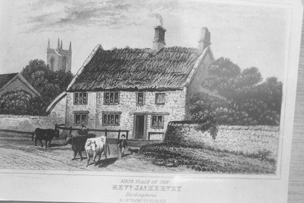 Hervey House is the birthplace of the Revd James Hervey, believed the oldest secular building in the village. This is a print of an early 19th century engraving.