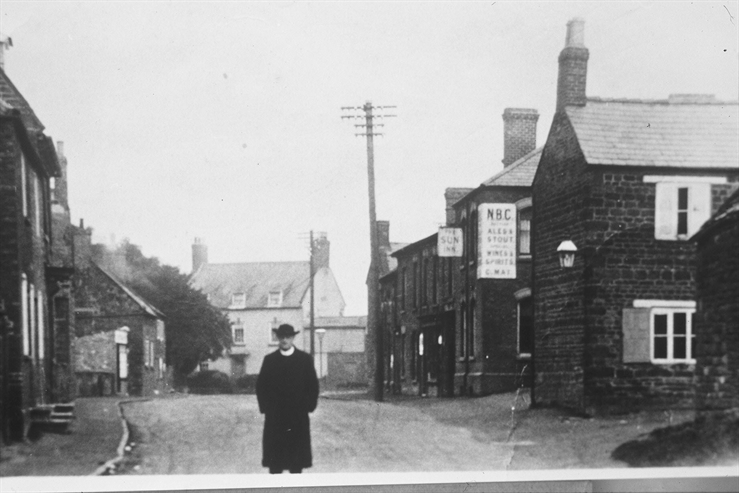 The Revd Massey, who was vicar of St. Edmunds 1920 to 1930, pictured in the High Street. Behind him to the east is The Green and to his left are the Sun public house, and the village blacksmith's forge. Note the low shop in the middle distance left, which was Taylor's butchers. Currently (2019) it is a hairdressers called 'Cut n' Curls'.