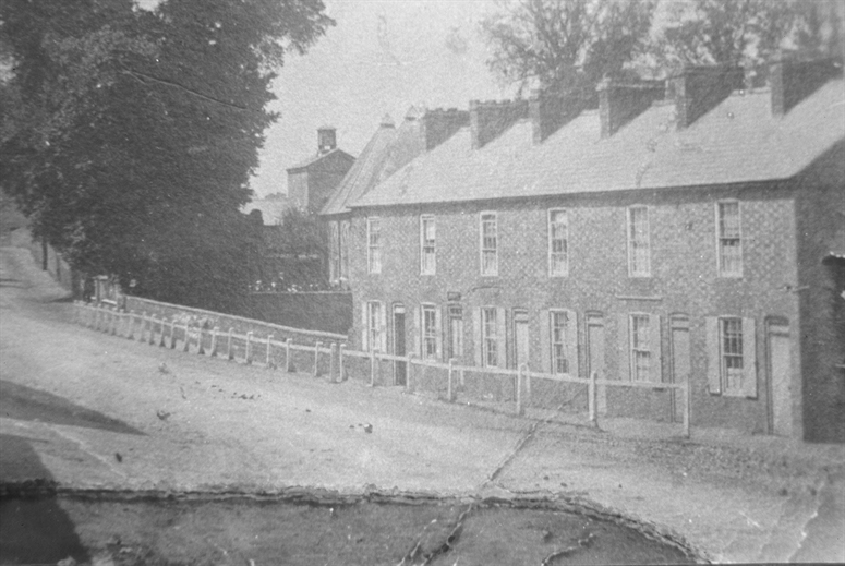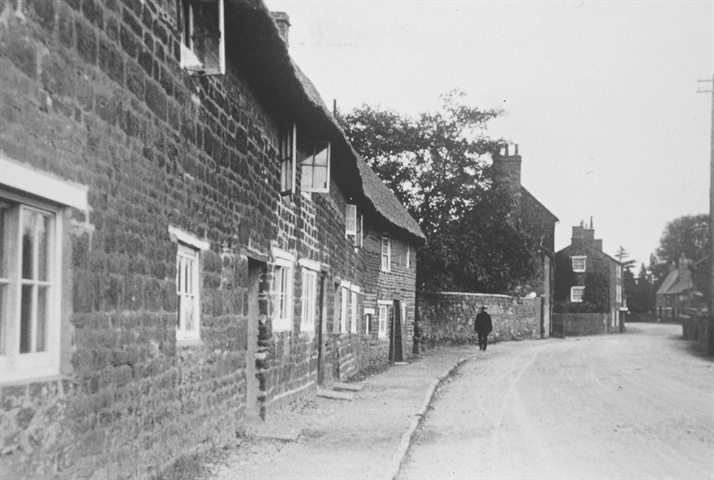 Looking east into the village, the row of six cottages with their original doorways clearly visible, before the road level was raised.